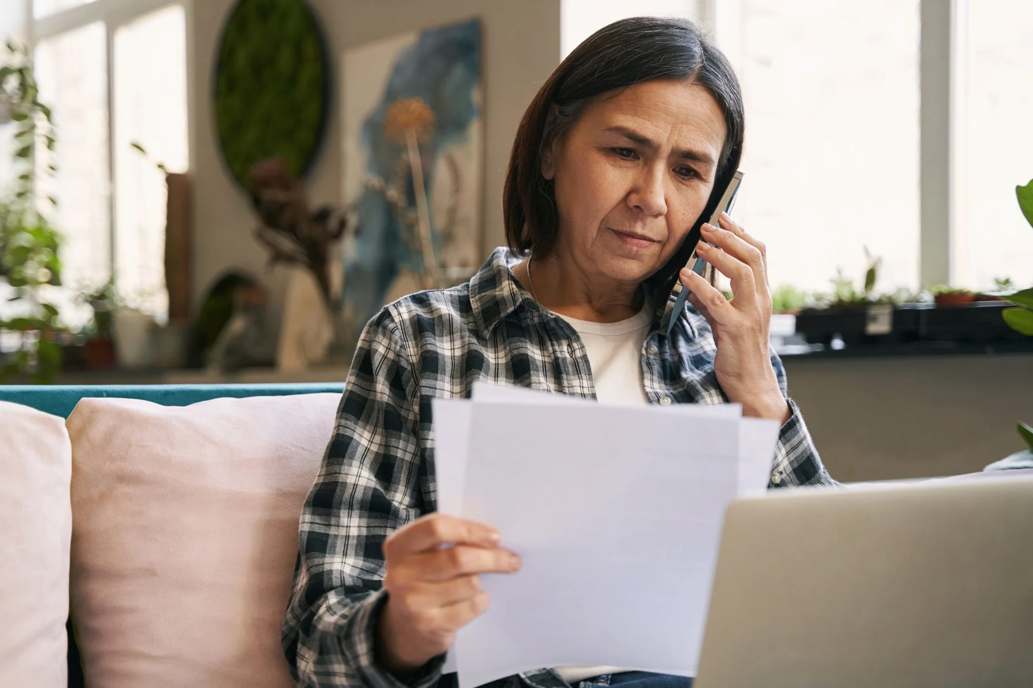 an elderly white woman holds onto her phone and looks at a few sheets of paper